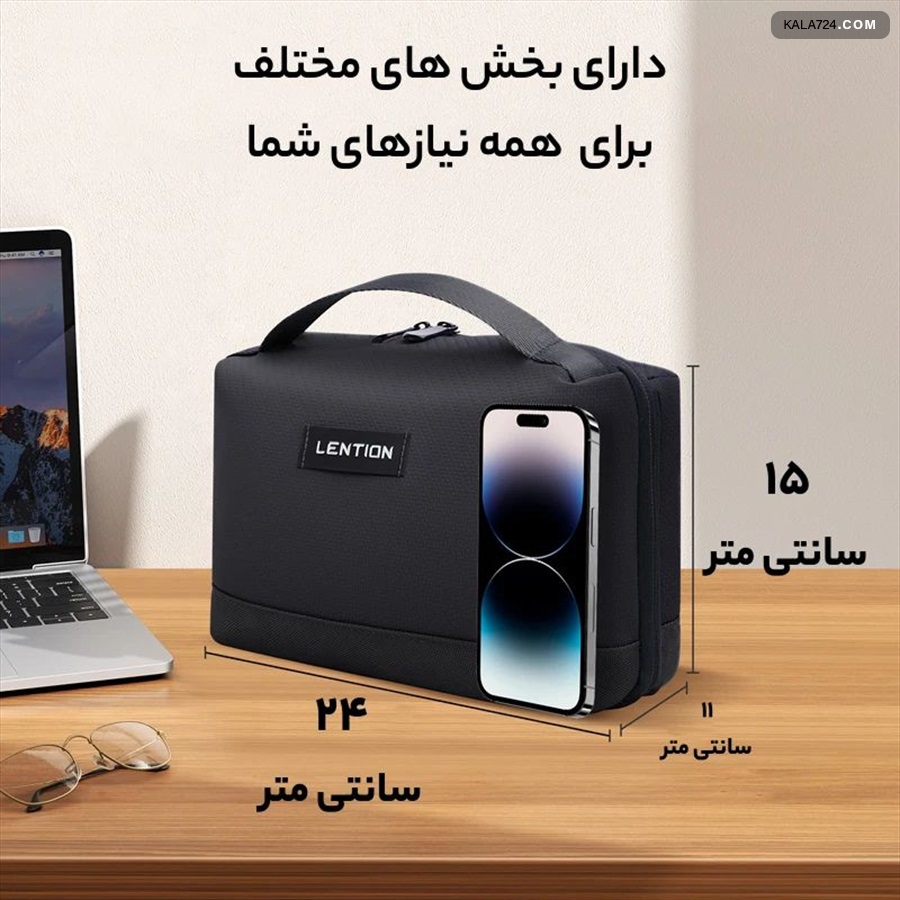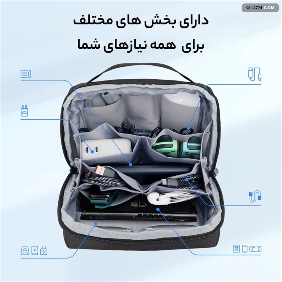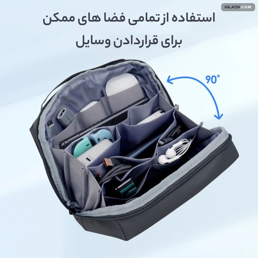 طراحی داخلی بی نظیر – دارای چندین جیب و بخش داخلی برای کابل‌ها، شارژر، پاوربانک و لوازم جانبی